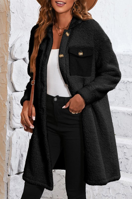 The long teddy coat is a stylish and cozy choice for winter wear.Contrast flap pockets add a chic touch to this delicate coat.The single-breasted design...
