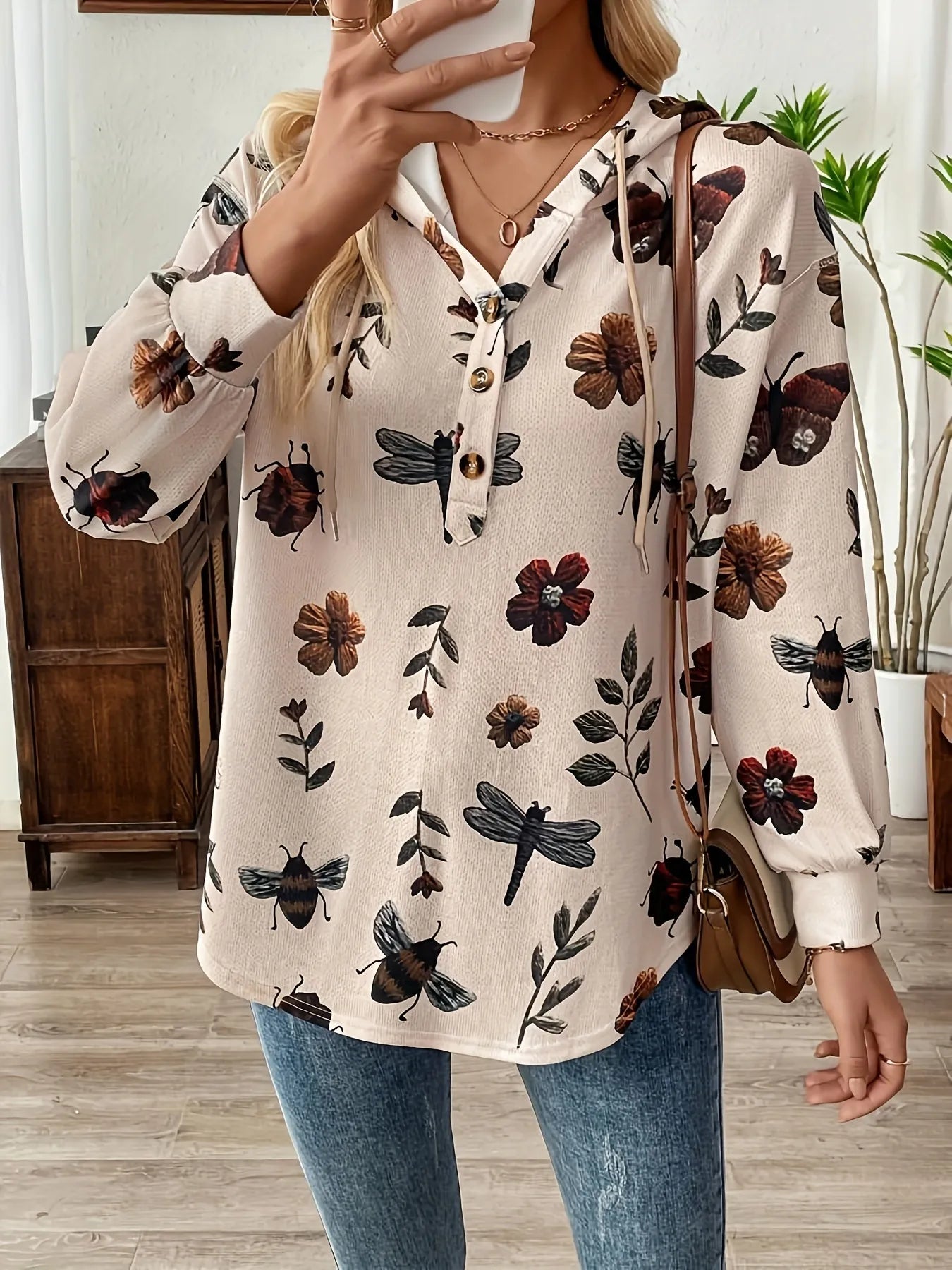 Features: Buttoned, Drawstring Sheer: Opaque Stretch: No stretch Material composition: 100% rayon Care instructions: Machine wash cold. Tumble dry low. Imported Size US Top Length...