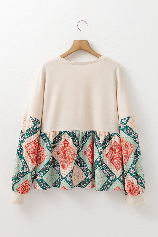 Step into cozy charm with this top. Featuring a playful mix of patterns, bubble sleeves, and a breezy fit, it’s perfect for layering on crisp cooler days. With its comfy crew neck and casual vibe, it’s your go-to for pairing effortlessly with leggings or favorite casual pants. Make this unique staple part of your everyday wardrobe fun! Polyester/Cotton/Spandex