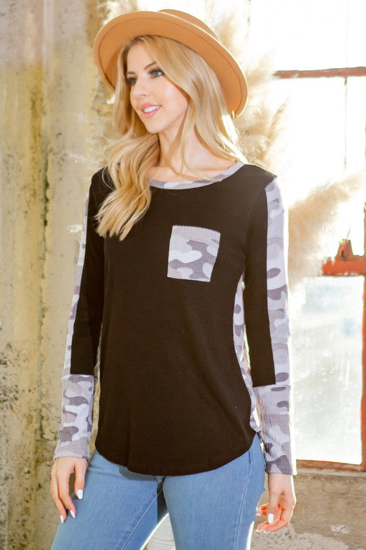 Light weight sweater with textured camouflage print contrast